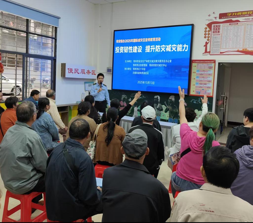 10月13日,鄂州市应急管理局联合市防灾减灾中心,共同走进鄂城区和贵园社区,开展以“投资韧性建设,提升防灾减灾能力”为主题的防灾减灾宣传进社区活动。活动通过“科普课堂 技能实训”的创新模式,为社区居民带来了一场内容丰富、实用性强的防灾减灾知识“盛宴”。